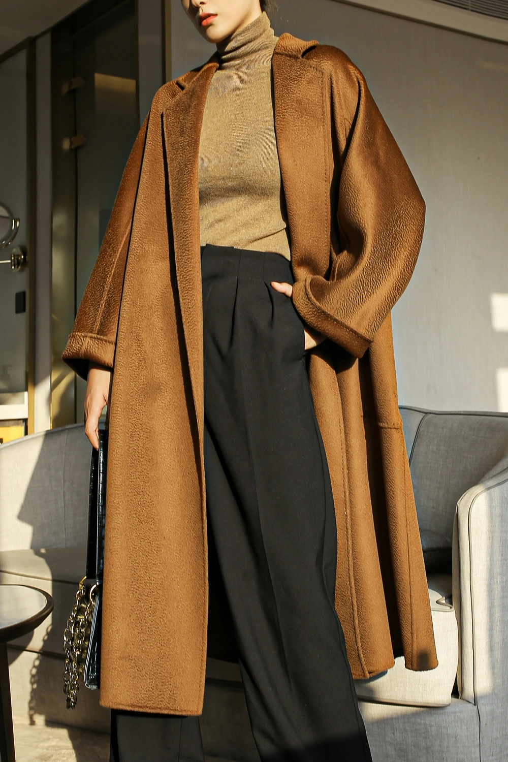 High-end Reproduction of the Classic Large Umbrella Hem Bathrobe Caramel Color Reversible Water Ripple Wool Coat Fashionable