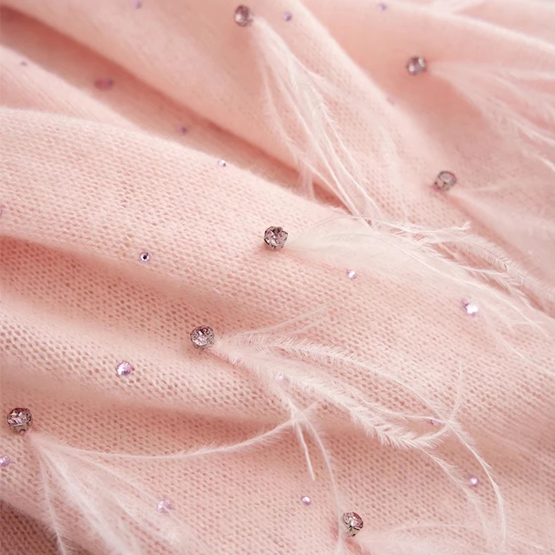 - About Luxury Hot Fix Rhinestone Designs Tassels Knitwear Short Cotton Knitted Sweater Women with Ostrich Feather